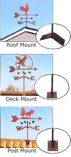 Your choice of Garden Stake, Deck Mount, Roof Mount, or Post Mount styles. Garden Stake is 60"H. Deck Mount is 15"H and attaches to any horizontal surface with a 3"x3" mounting plate. Roof Mount is 15"H and conforms to roof pitch. Post Mount is 15"H and attaches to any vertical surface with a 3"x3" mounting plate. The weathervane tops are 21"W (arrow) and 6" to 10" in height, depending on the design.